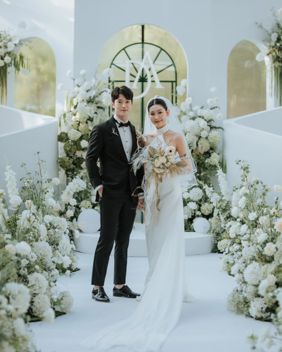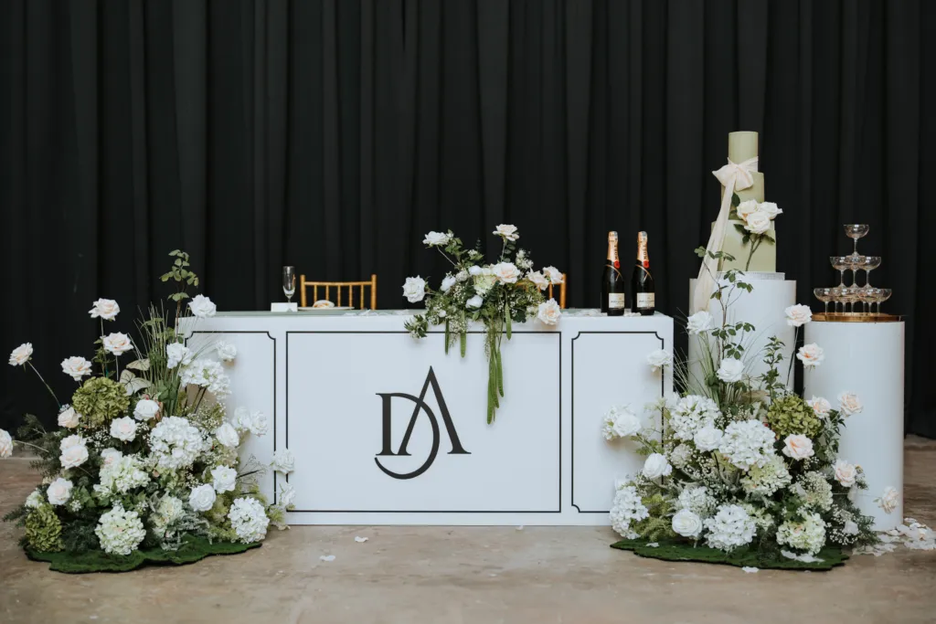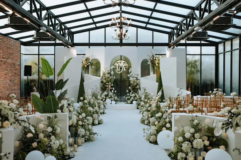 The decor at W Factory reflected a minimalist yet luxurious theme, dominated by a soft white and sage green color palette, with hints of blush and gold. The ceremony backdrop featured arches adorned with cascading blooms, including white roses, hydrangeas, and greenery, creating a dreamy garden-like setting within the industrial space. The couple’s monogram, a chic “DA” design, took center stage, adding a personalized touch to the decor.