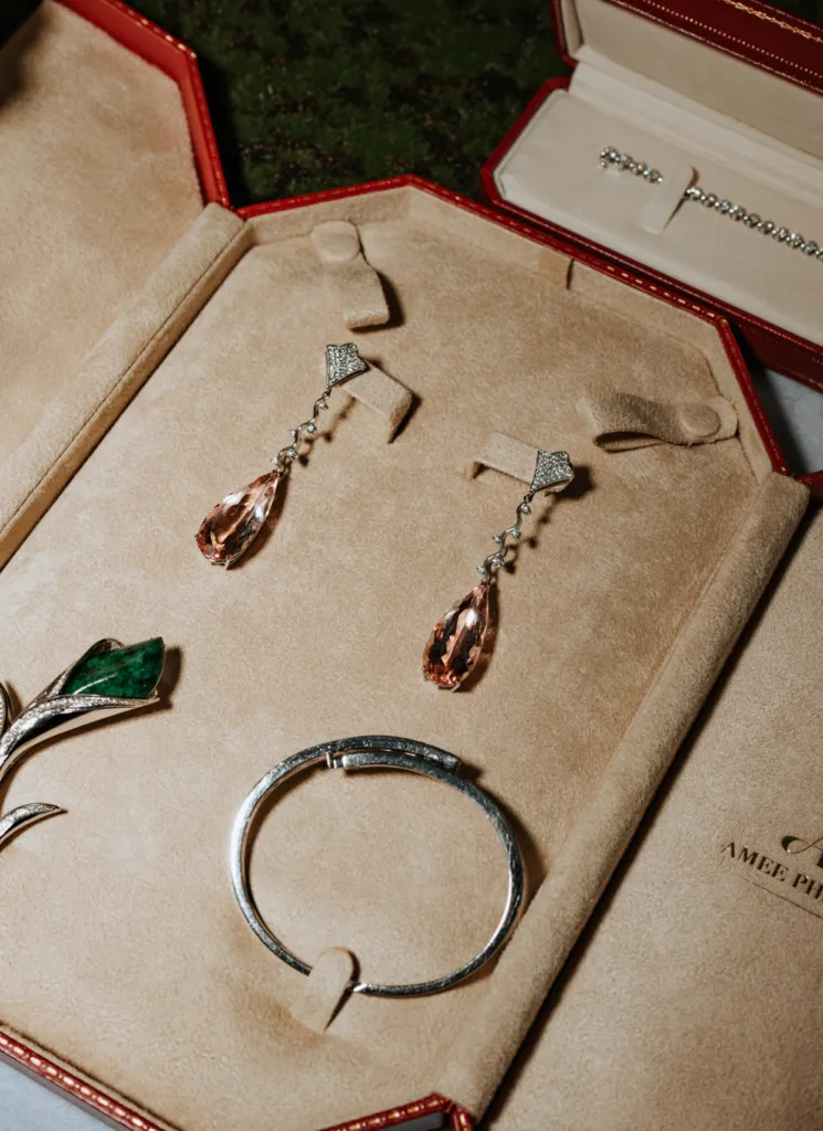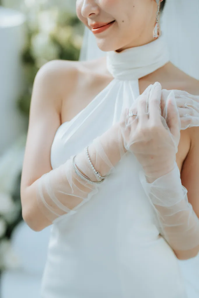 Anjoe’s bridal look was nothing short of timeless. She wore a sleek white satin halter-neck gown, beautifully complemented by a fingertip-length veil. The addition of sheer gloves added a touch of modern romance to her ensemble. Her vintage accessories included rose-gold drop earrings, a white gold bracelet, and a delicate brooch, tying together a sophisticated and polished bridal aesthetic.