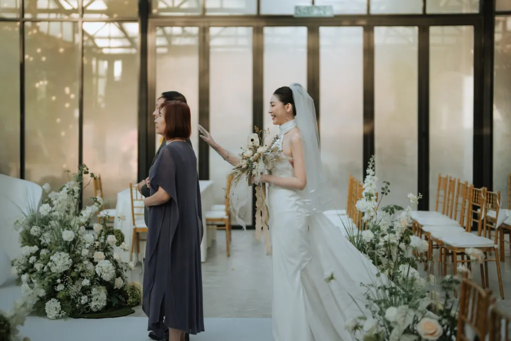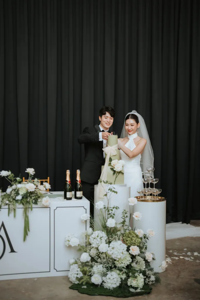 Daniel and Anjoe’s wedding day was a modern yet sentimental affair, bringing together a unique blend of industrial aesthetics, heartfelt moments, and a deeply personal touch, hosted at the newly unveiled W Factory. The lush floral installations added a soft touch to the rather clinical space, transforming it into a serene yet stylish venue.