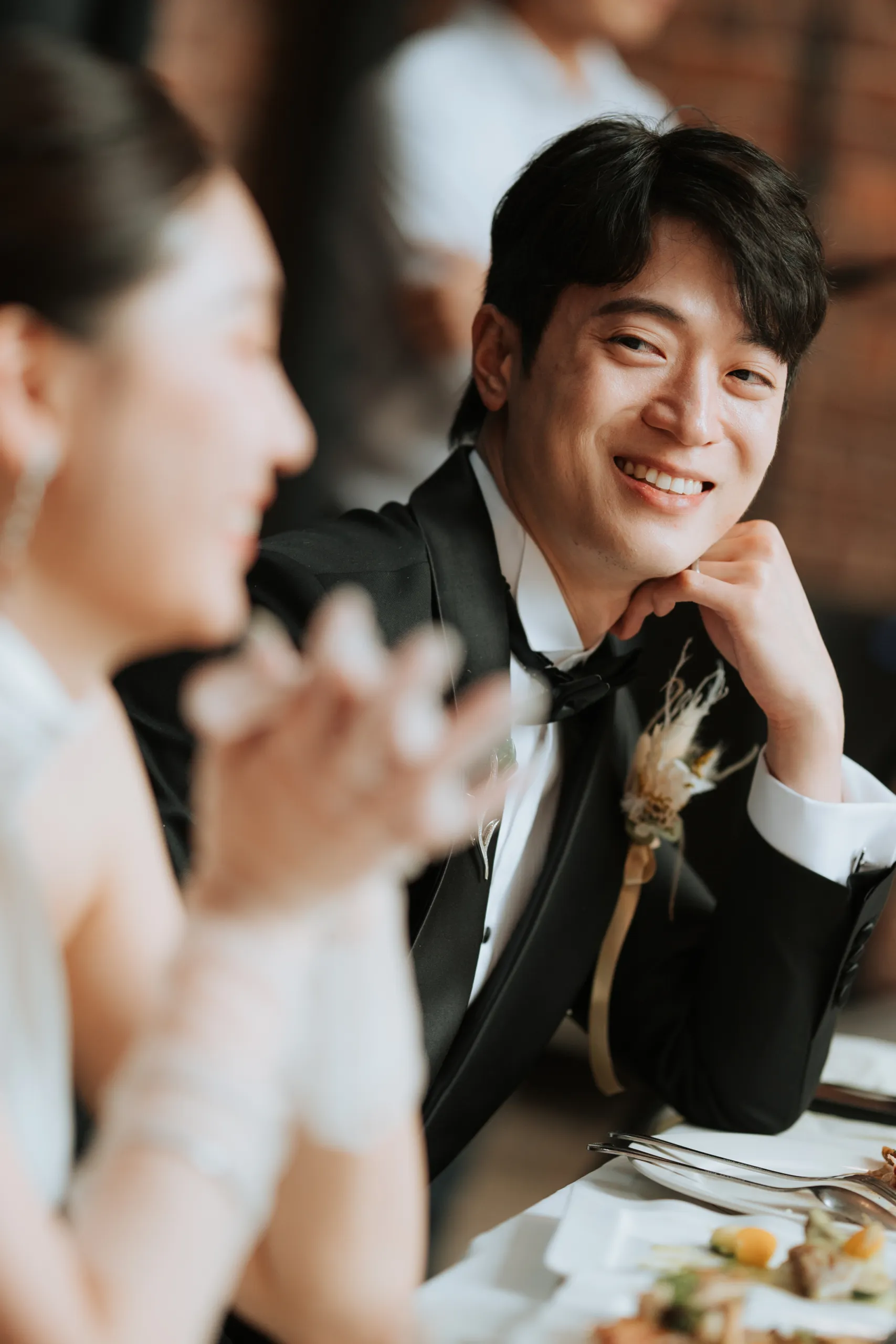Daniel was equally dapper in a classic black tuxedo, accented with a boutonniere that featured dried florals and gold ribbons, adding a contemporary edge to his look. Together, the couple looked effortlessly elegant.