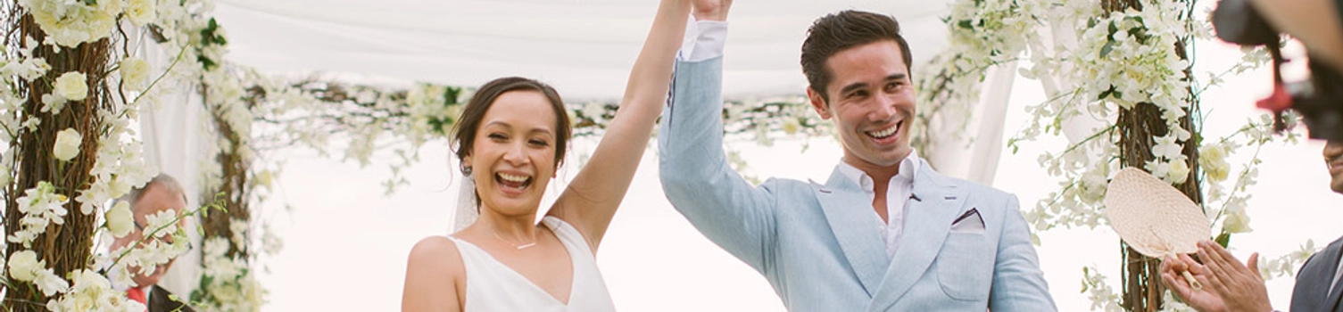 An intimate soiree filled with cocktails, summer breezes and partying late into the night are all reminiscent of a luxe Hamptons party in the summer. Aside from the all-white glamour of this wedding, we love the unexpected details that made it really stand out, from the bridal bouquet of cascading white orchids to the groom’s light linen suit and the mother of the bride’s sleek and gorgeous jumpsuit. The white floral décor added to the beauty of the day, starting with the breathtaking floral arch and continuing with the reception table centerpieces. Many thanks to Nigel Lim Photography for capturing these stunning shots.