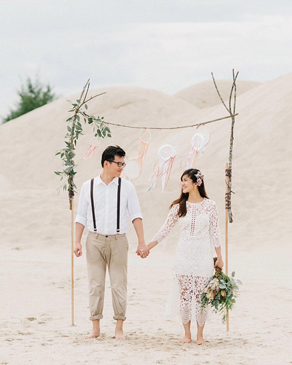 Set against the perfect backdrop of clear blue skies and sandy dunes that resembled a blank canvas, these bridal portraits made excellent use of the wonderful space. With a sweet lace dress and flowers in her hair for her and suspenders for him, the newlyweds went barefoot for a relaxed, bohemian vibe. We love the floral details here, from the décor to the bride’s anklets – what a dreamy touch! Thanks to Peter Herman Photography for these.