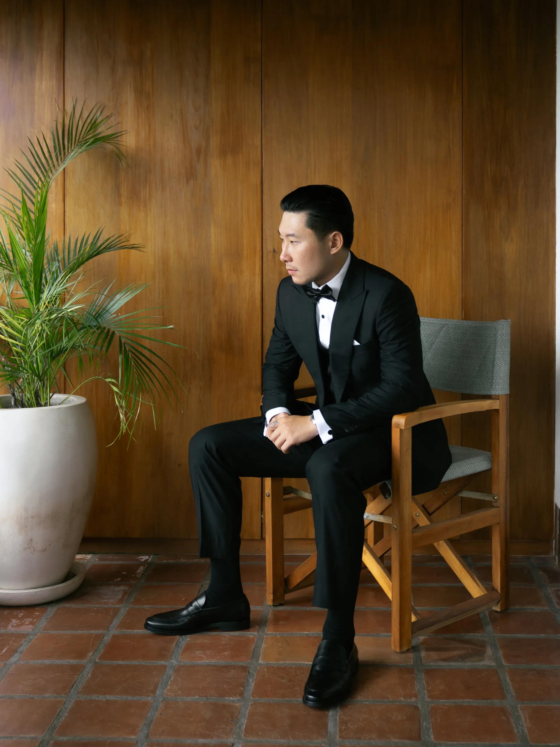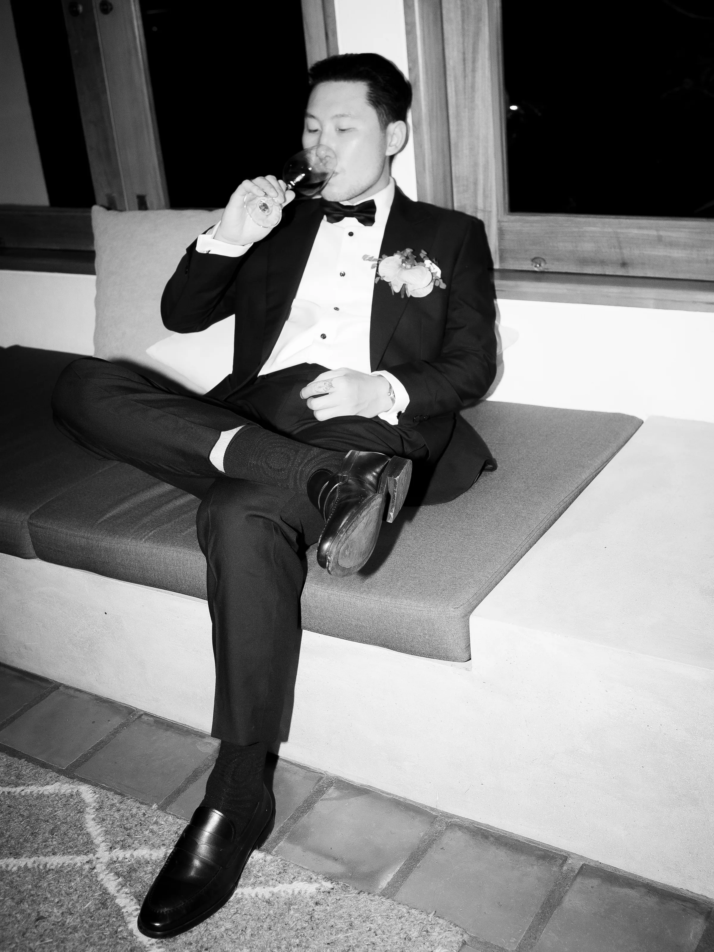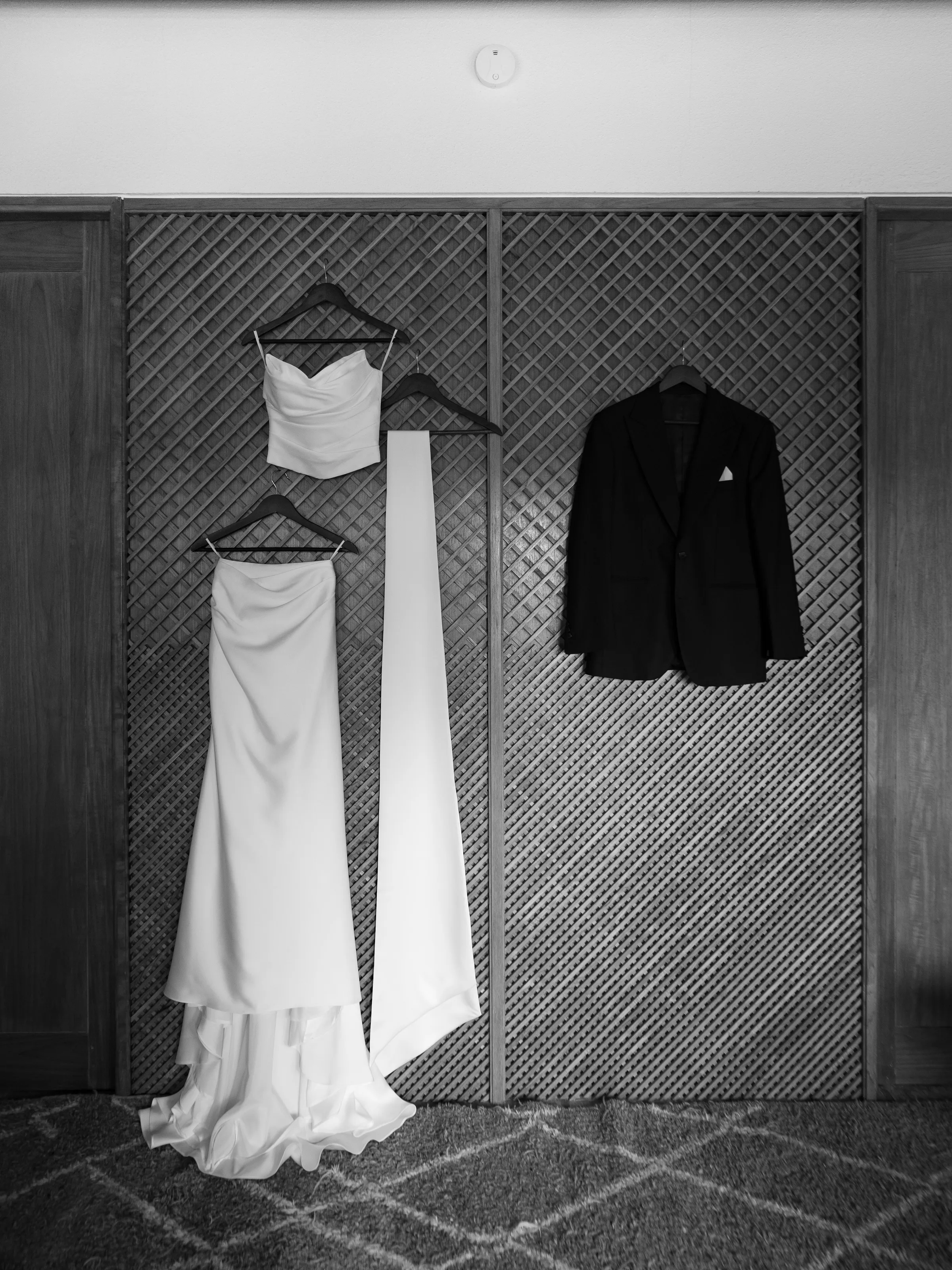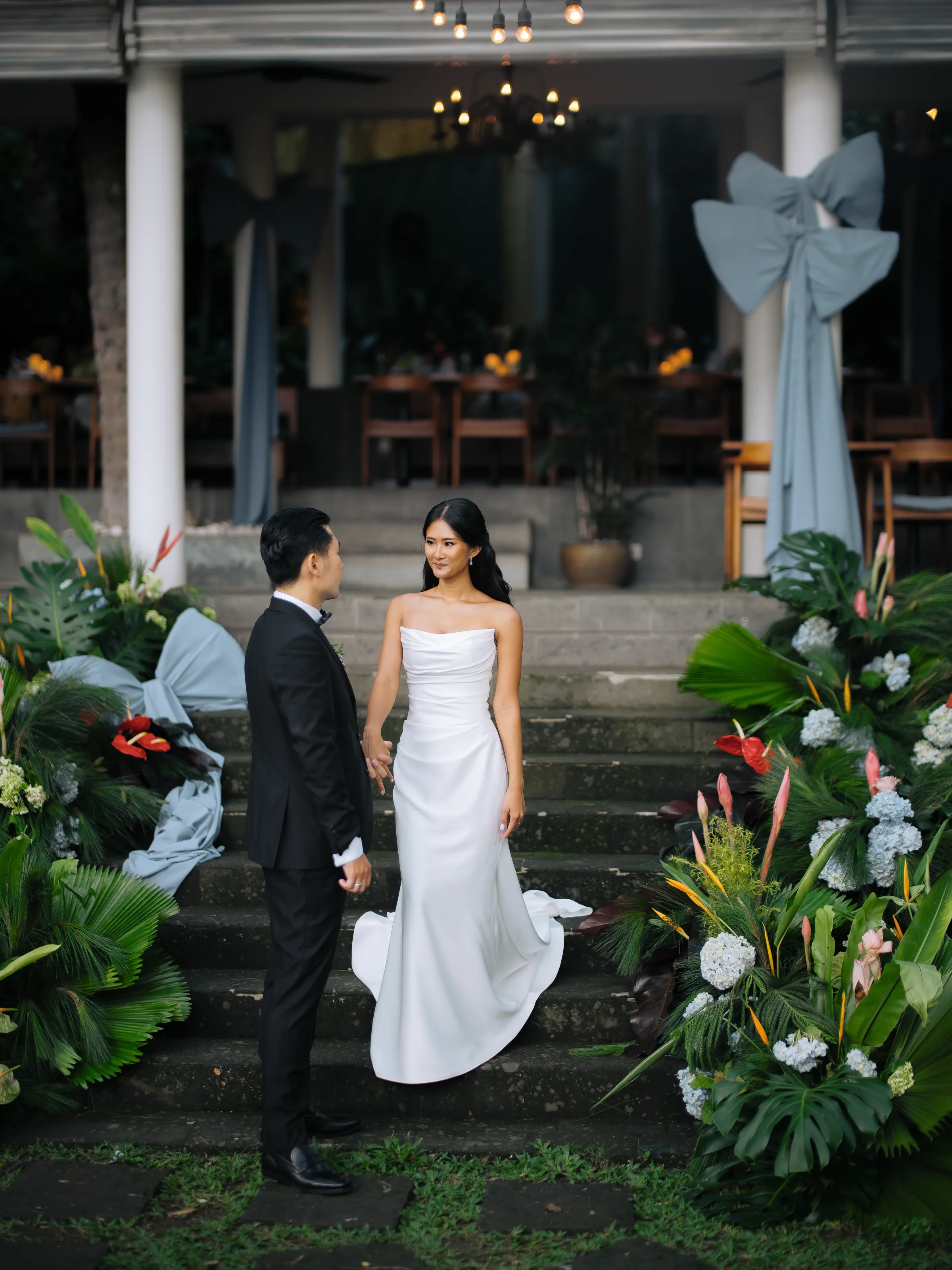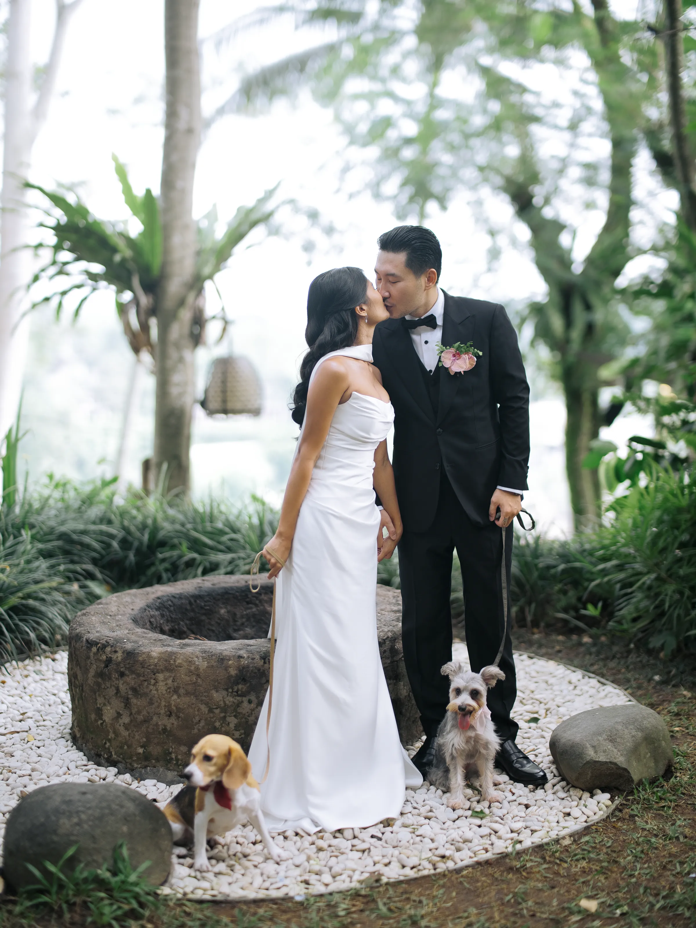 The bride chose a minimalist gown with clean lines and a timeless silhouette, accompanied by thoughtful accessories. Paired with her natural grace, the look exuded quiet sophistication. The groom mirrored her refined style in a classic black tuxedo, together embodying a polished yet relaxed charm. Even their beloved dogs were part of the day, adding warmth and personality to the occasion.