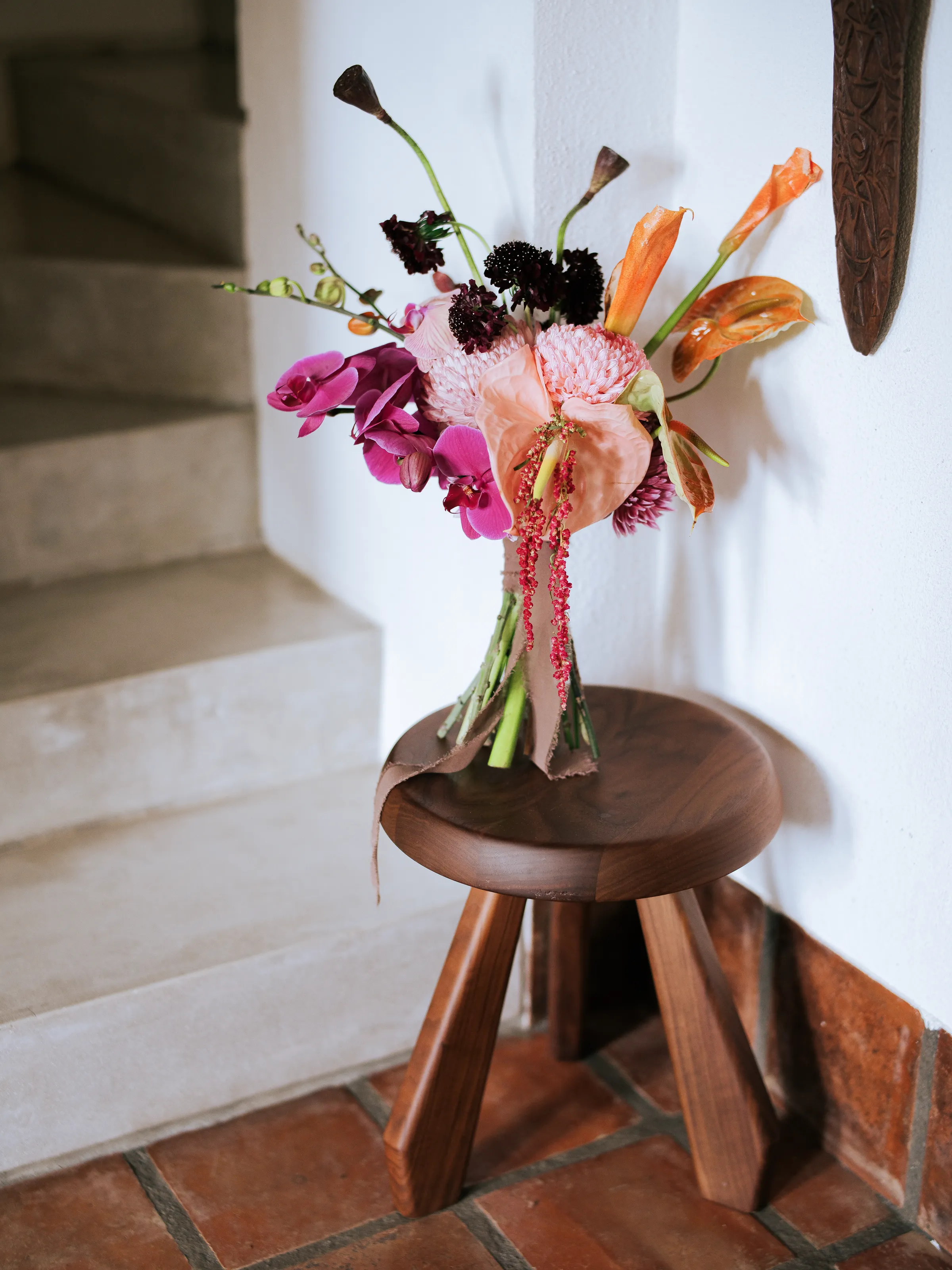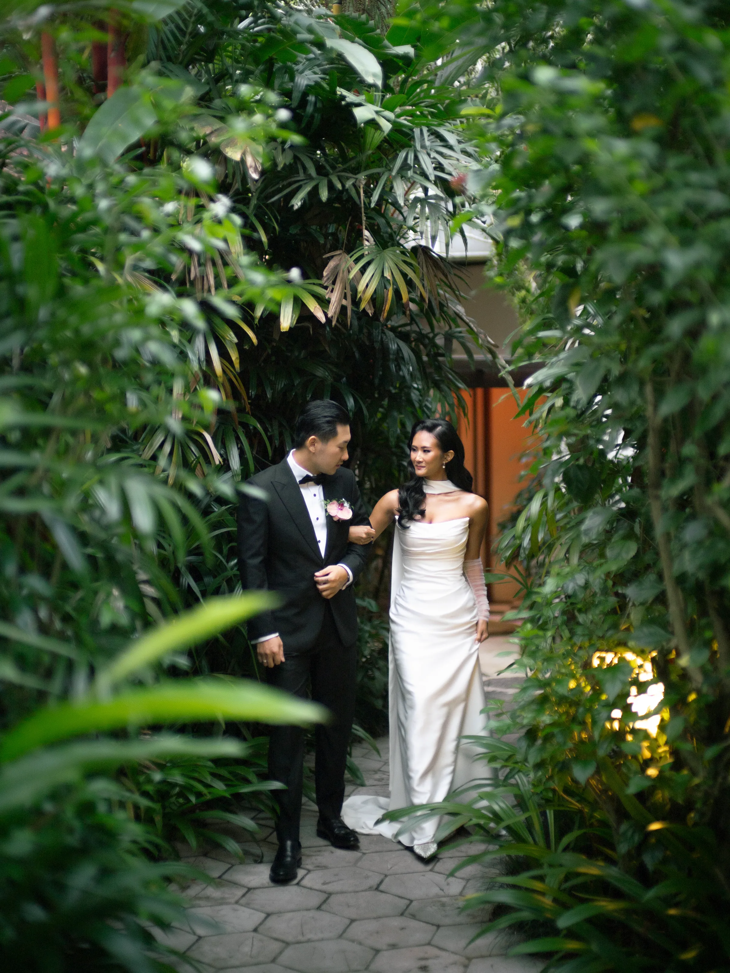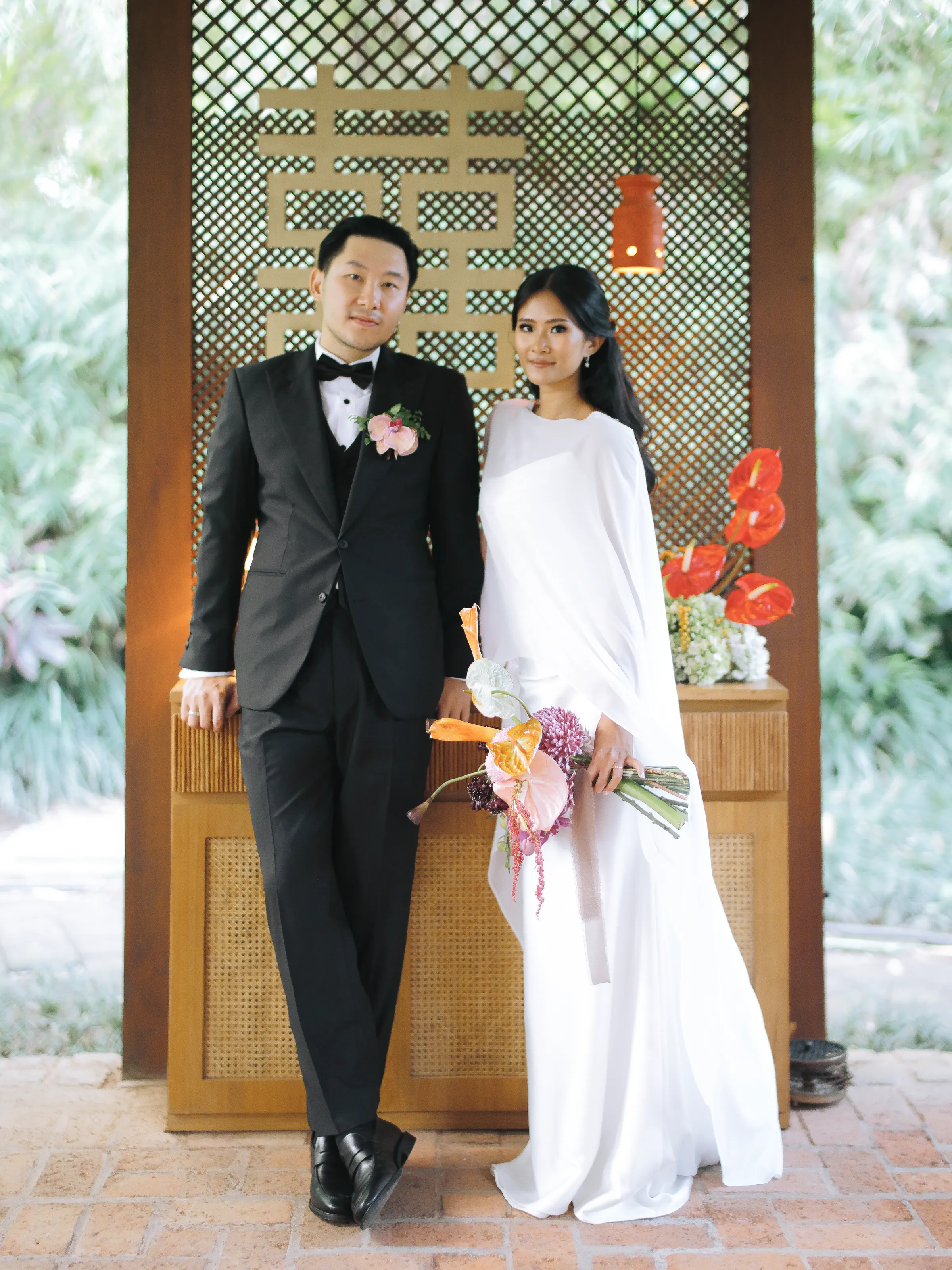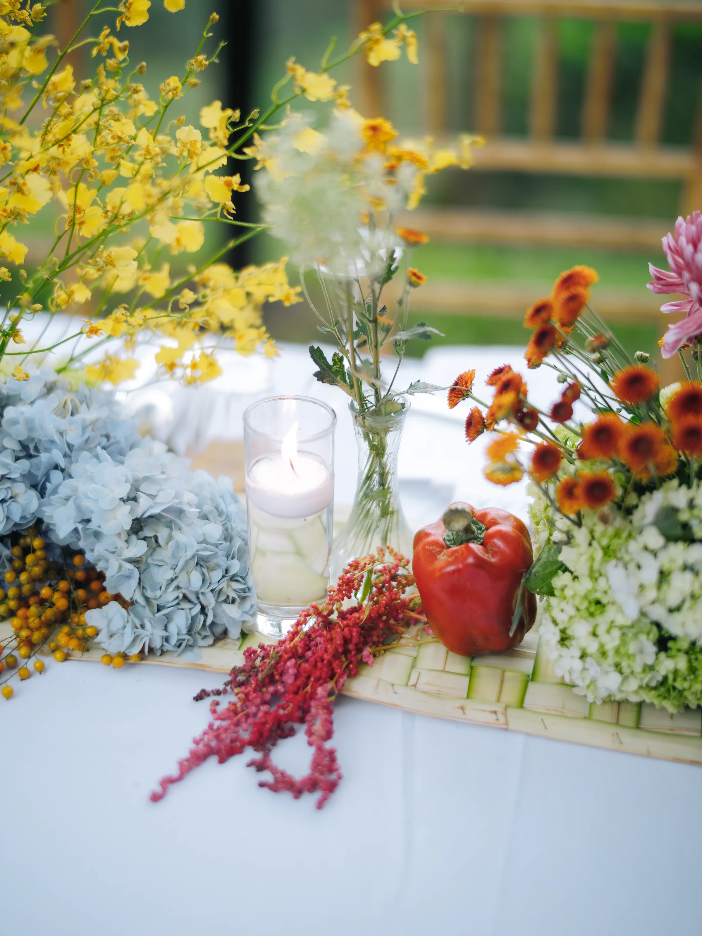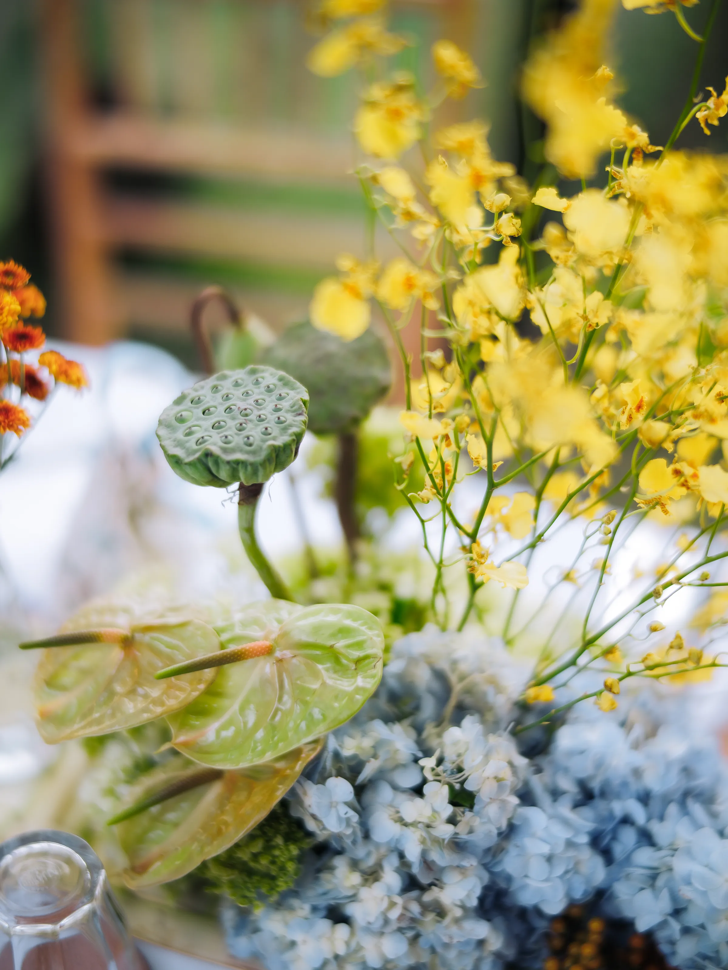 Set against lush greenery, the celebration carried a laid-back, tropical elegance. Décor was thoughtfully curated with a modern organic touch: woven palm leaf runners, vibrant hydrangeas, lotus pods, and tropical foliage paired with unexpected details like aubergines and long beans, creating a playful nod to rustic authenticity. It was styling that felt alive, textured, and refreshingly uncontrived.