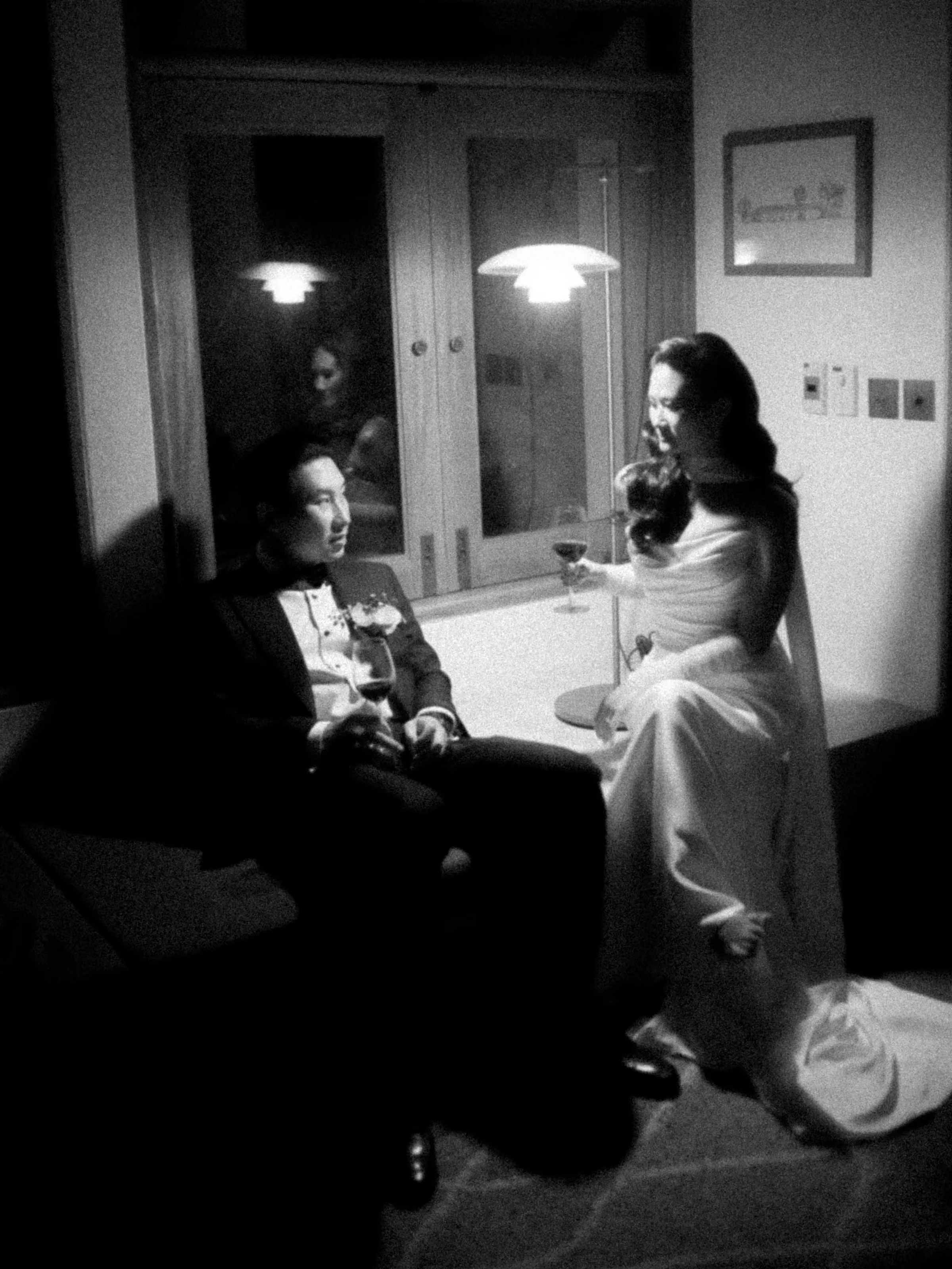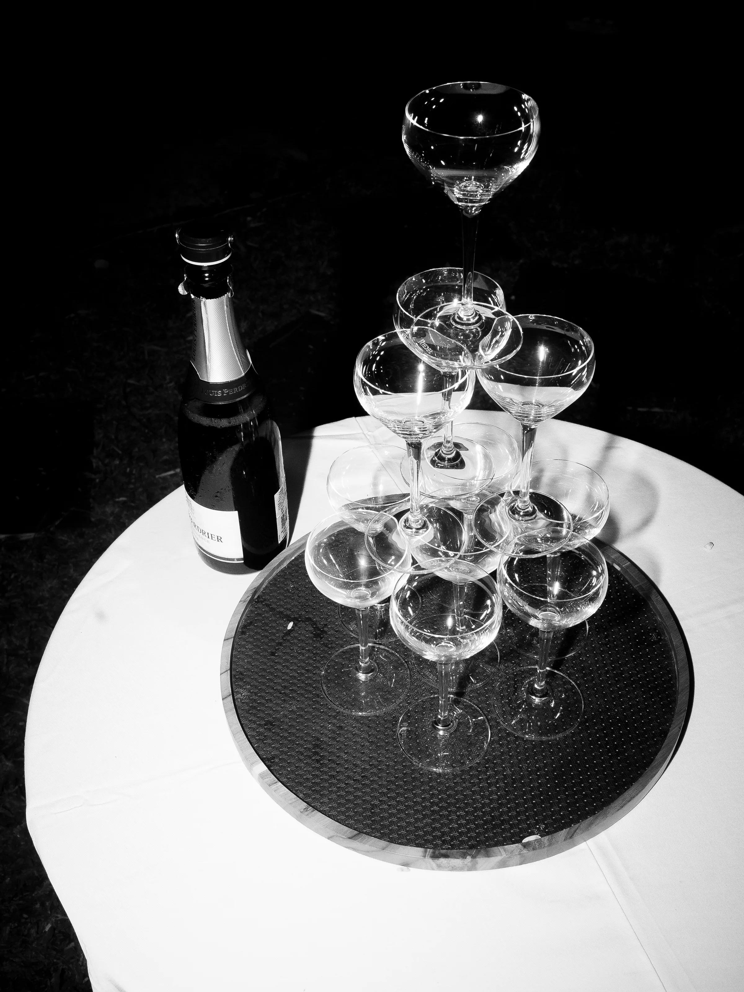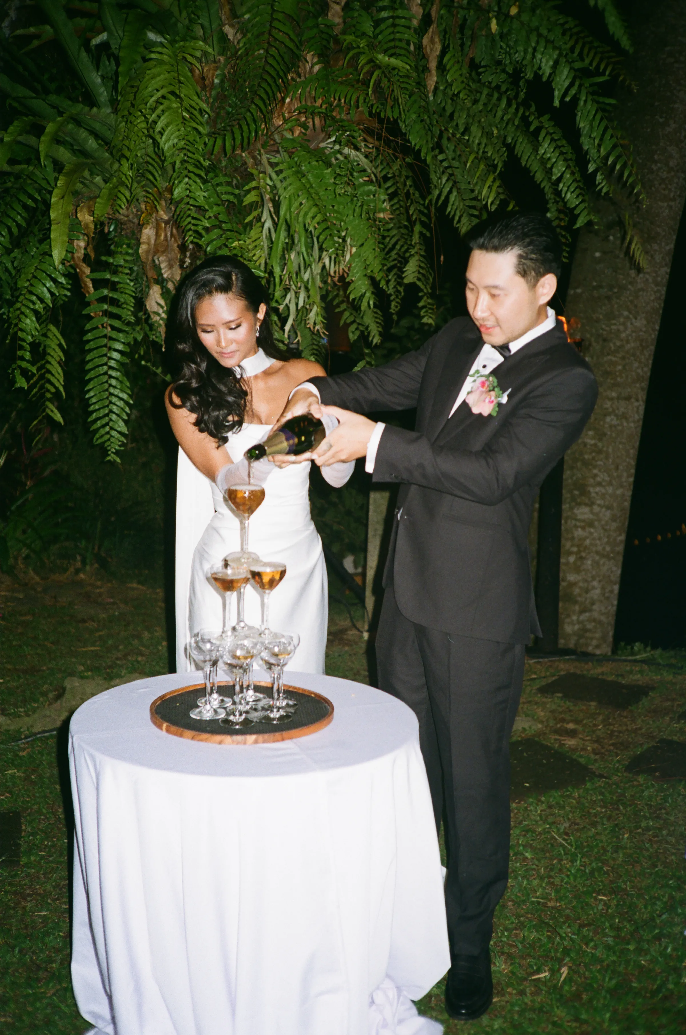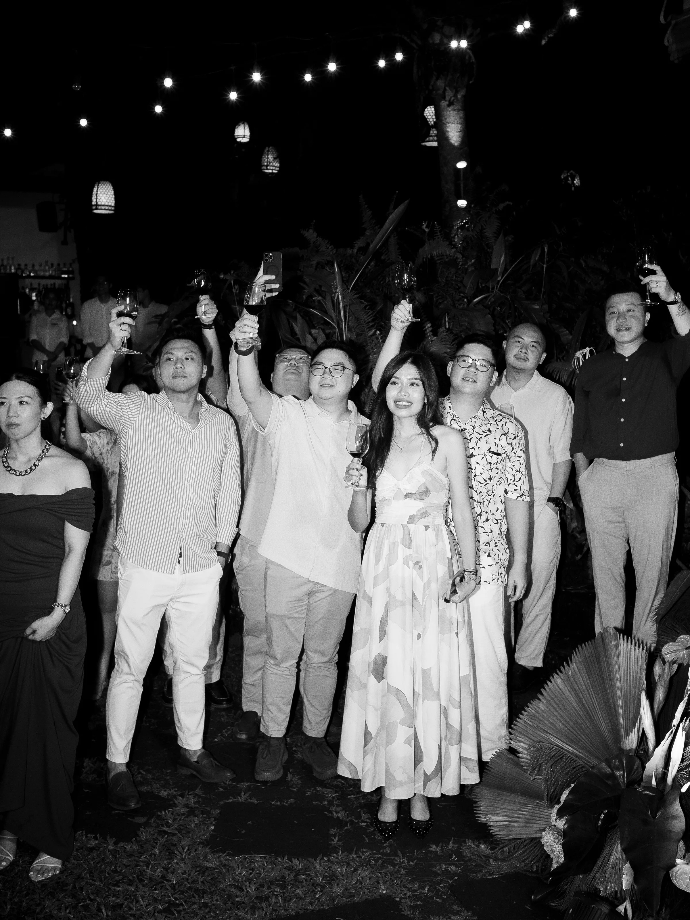 The mood shifted seamlessly from day to night. Guests gathered under strings of warm lights, toasting the couple with glasses held high. A champagne tower added a glamorous touch, while moments captured in black-and-white echoed the timeless feel of old cinema. Together, it created an atmosphere that was both celebratory and deeply heartfelt.