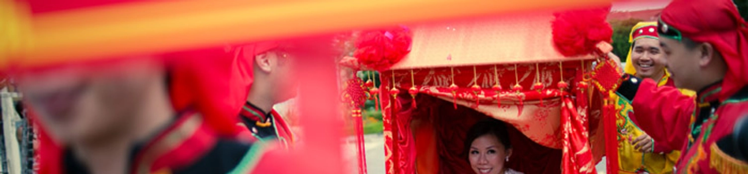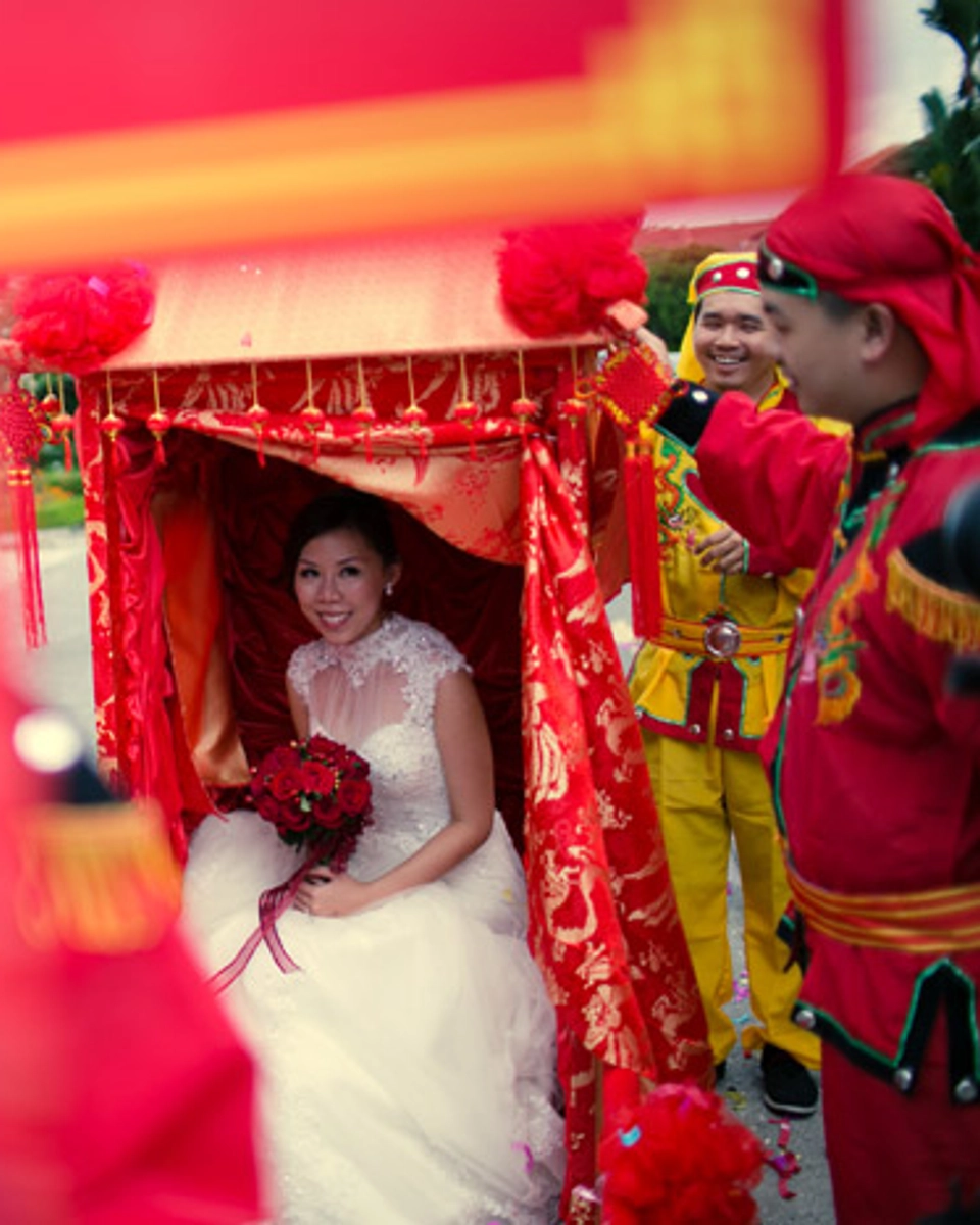“Jerry and his entourage came carrying the Chinese bridal sedan chair and with a tray of good wishes for the couple’s happiness and prosperity all written in Chinese calligraphy. After the gate crashing ceremony, the bride was carried to the groom’s house in this traditional sedan chair. The groom then kicked the sedan chair to symbolise his having successfully wed his beautiful bride.